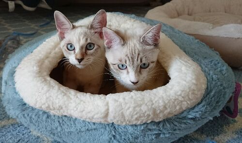 マカロン買いました。 目の色とおんなじ水色。 期待通りに入ってくれて嬉しい♪ もうひとつ三匹が一緒に寝れるベッドも買いました。大きい〜 シャロンが気づいてくれました!! チェックチェック念入りです。 ワクワク 次の瞬間〜〜〜〜!! シャロンはマカロ…